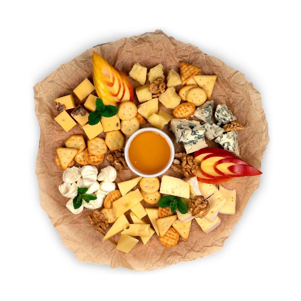 Пармезан, Бри, Эменталь, Дор Блю, Моцарелла, сыр с орехами, яблоки, крекеры, грецкие орехи, мёд, мята