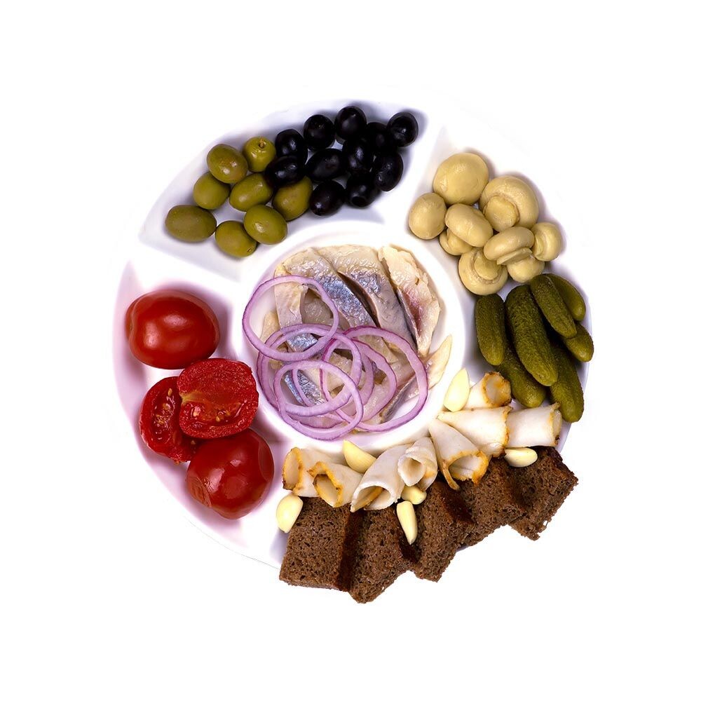 Cельдь солёная, сало, маринованные огурцы, маринованные помидоры, маринованные грибы, красный лук, оливки, маслины, чёрный хлеб