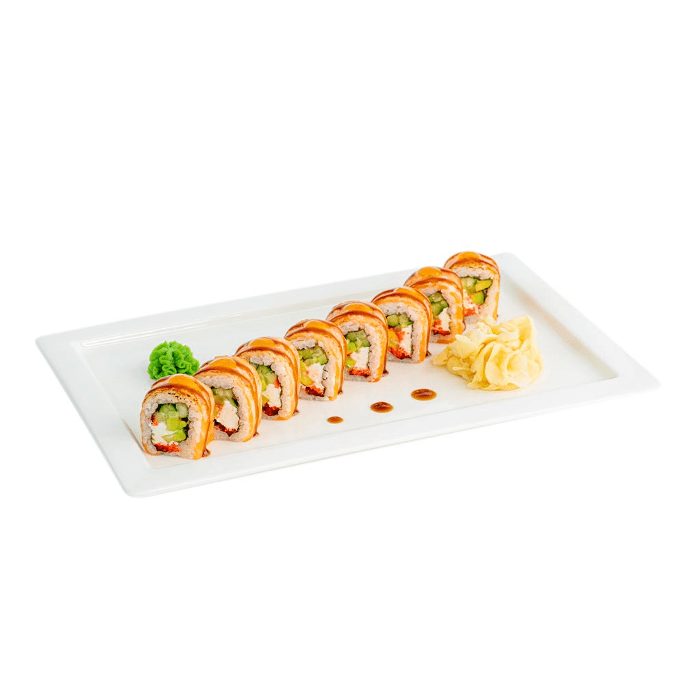 Ролл с опаленной семгой, авокадо, огурцом, сливочным сыром и икрой масаго. Полит соусом Унаги и Манго-Чатни