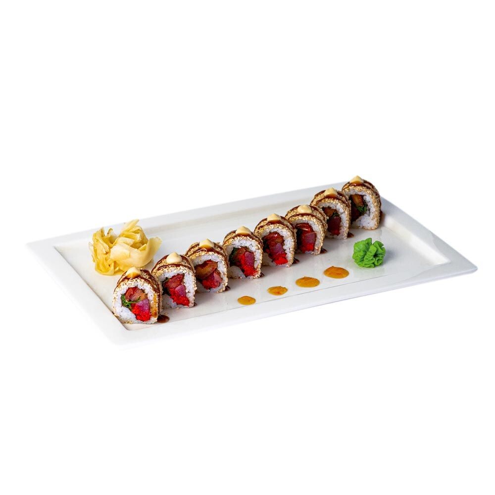 Ролл с тунцом, помидорами, соусом Sriracha, свежим шпинатом и икрой масаго. Посыпан кунжутом, подается с соусом Унаги и копченым соусом