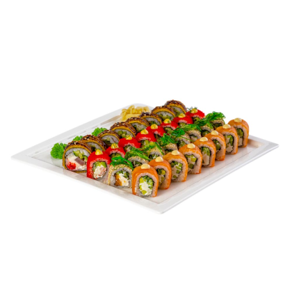 Для любителей фламбированного лосося и изысканных сочетаний. Взрыв вкуса по честной цене. Сет из 3 роллов (Лосось с огоньком, Зелёная Сакура, Калифорния с лососем)