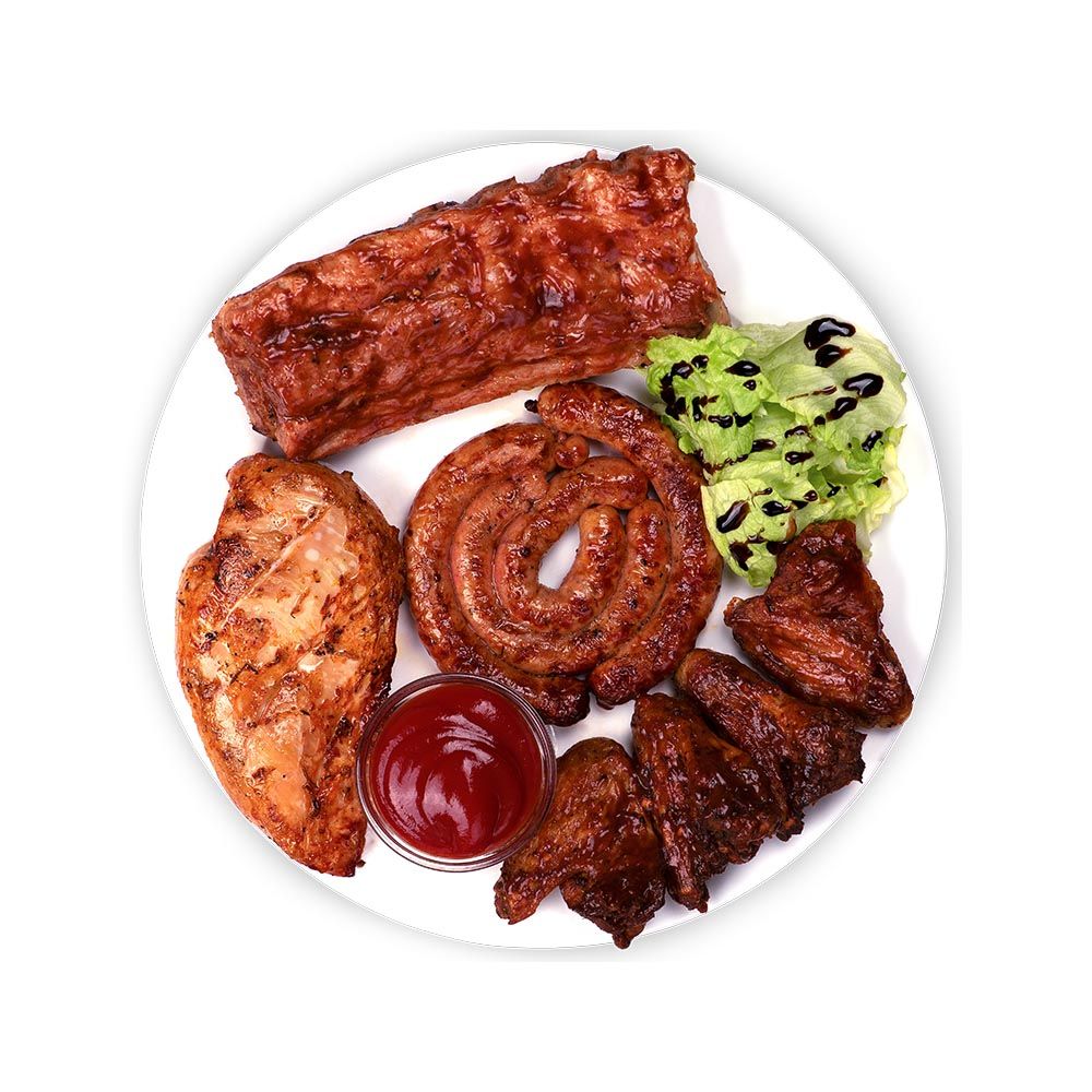 Friptură de pui, coaste BBQ, aripi de pui, cârnați, salată Aisberg, ketchup