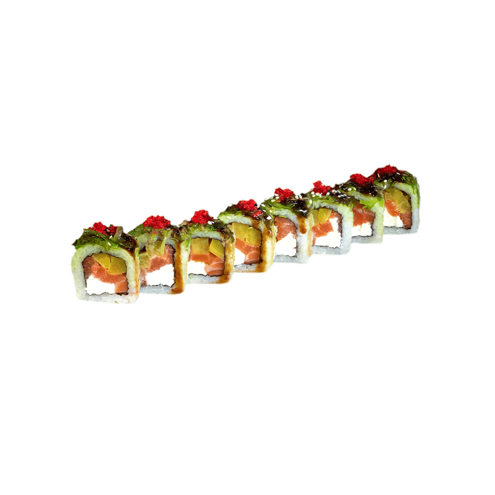 Roll cu somon, ridiche Daikon japoneză, cremă de brânză, salată Chuka, sos de susan și sos Unagi. Greutatea este indicată cu o eroare de +/- 7%