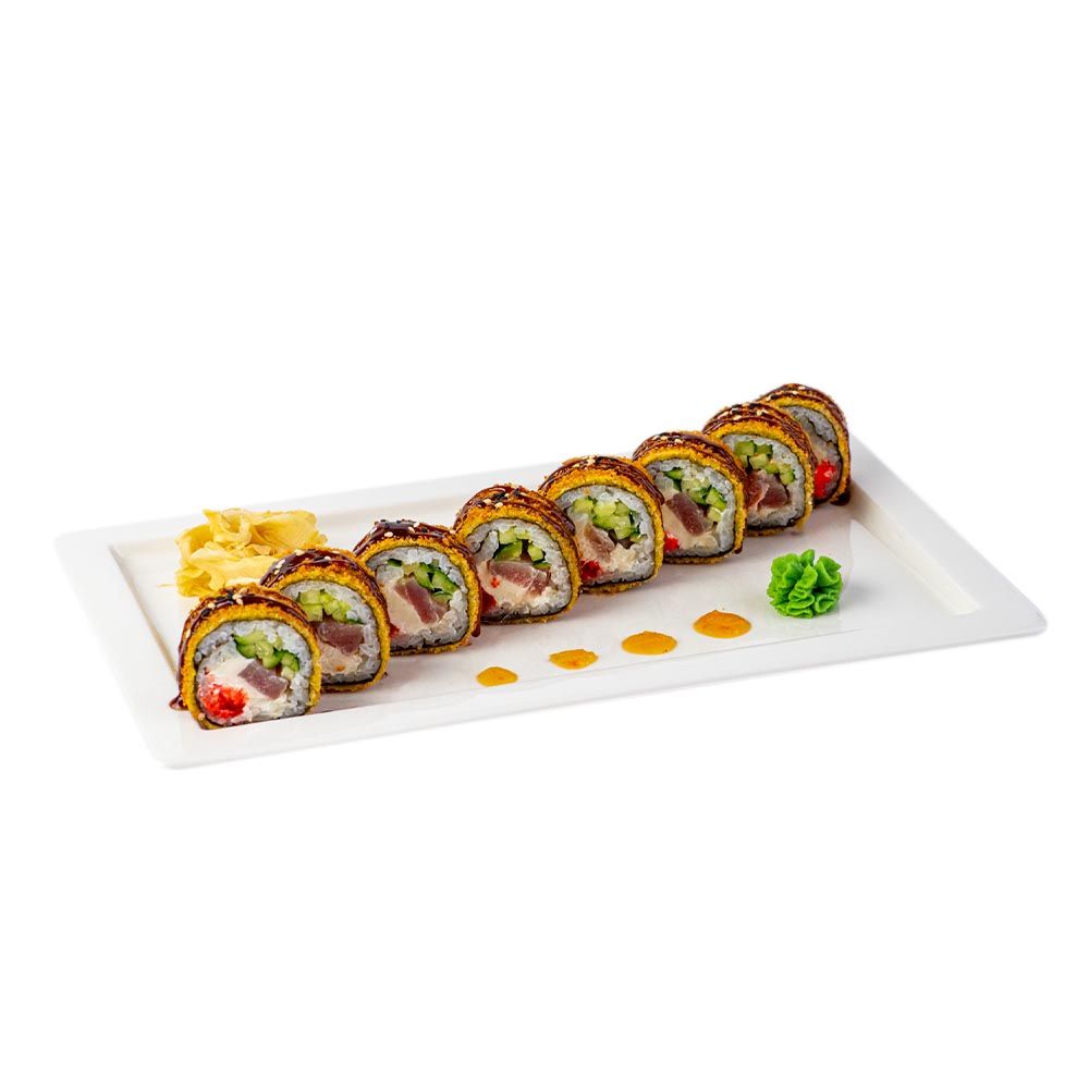 Roll tempura cu ton, cremă de brânză, icre masago și castraveți. Stropit cu sos Unagi și presărat cu susan