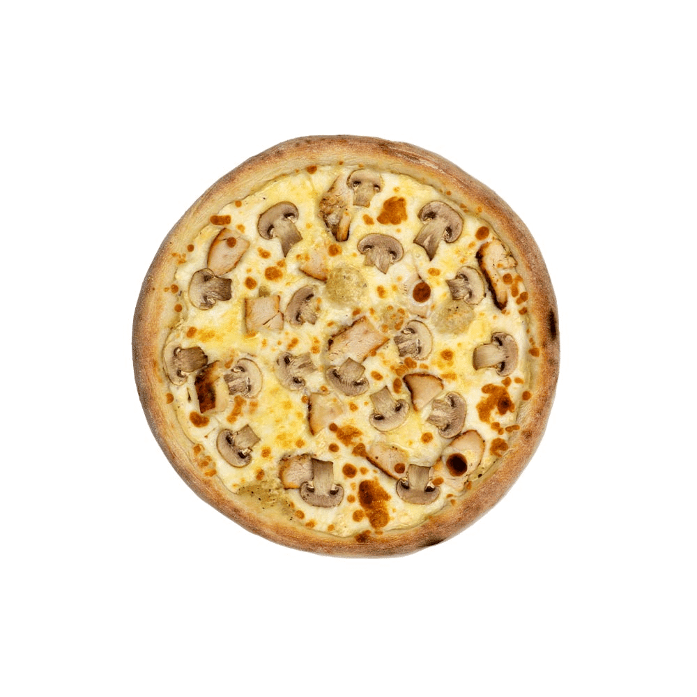 Este foarte îndrăgită de copii. Pizza aromată cu ciuperci, cu pui și ciuperci pe bază de maioneză. Greutatea este indicată cu o eroare de +/- 7%.
