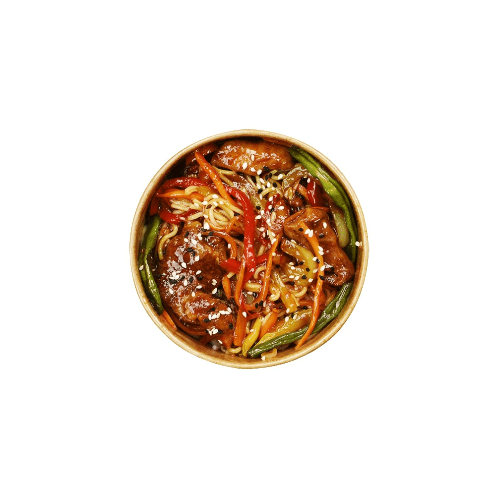 Tăiței multicereale cu carne de porc, amestec de legume și sos asiatic WOK. Greutatea este indicată cu o eroare +/- 7%.