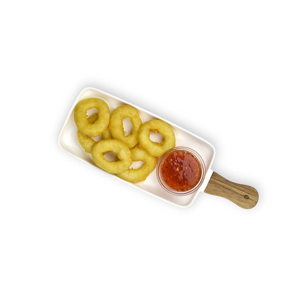 Inele de calmar în pane cu sos Sweet Chili. Greutatea este indicată cu eroare +/-7%