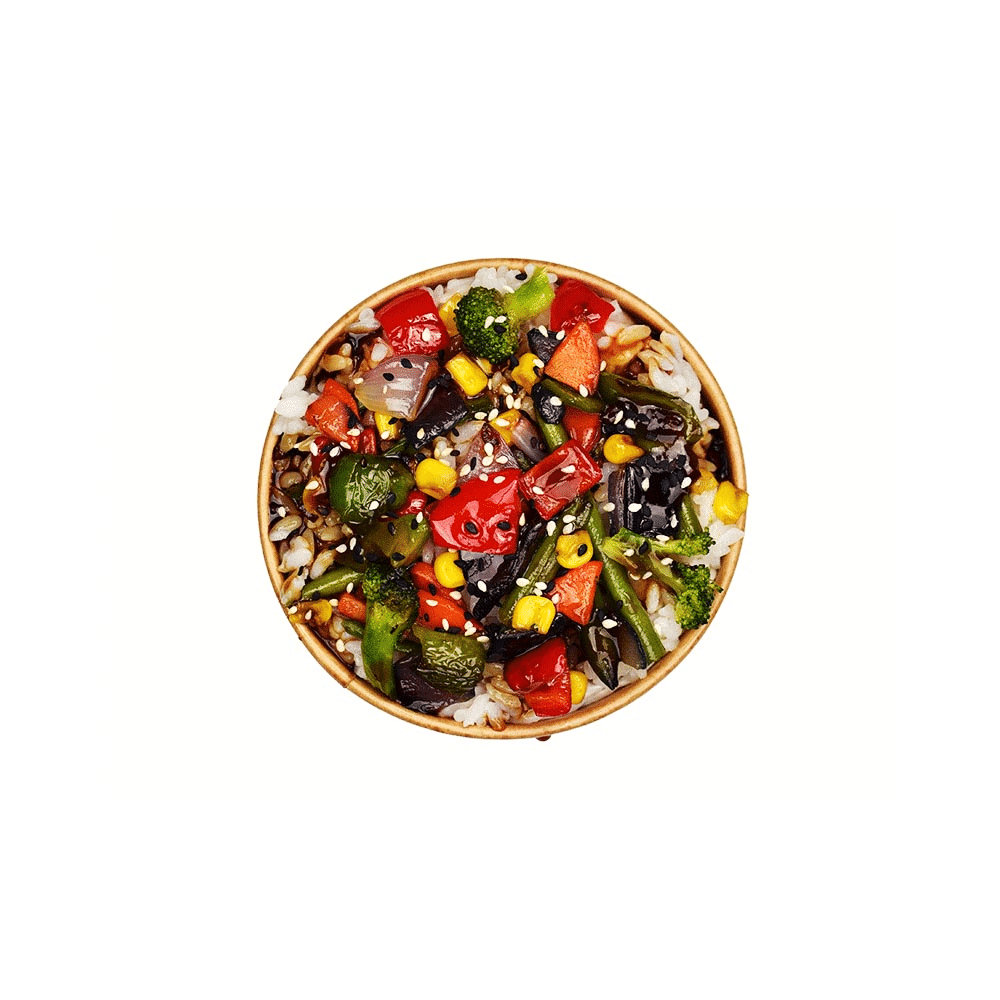 Orez japonez cu amestec de legume (broccoli, fasole verde, ardei dulce, ceapă roșie, morcov, porumb dulce) cu sos dulce-acrișor. Greutatea este indicată cu o eroare de +/- 7%.