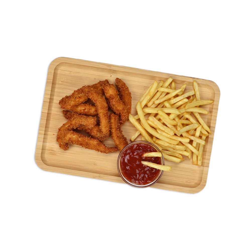 Nuggets de pui crocanți cu cartofi pai și ketchup. Greutatea este indicată cu o eroare de +/- 7%.