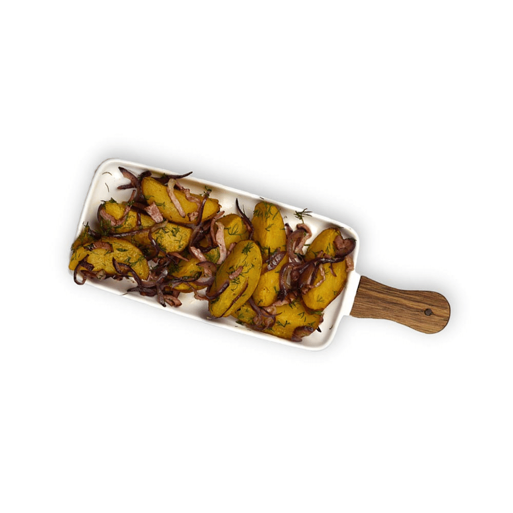 Cartofi rustici cu bacon și ceapă roșie. Greutatea este indicată cu o eroare de +/- 7%.