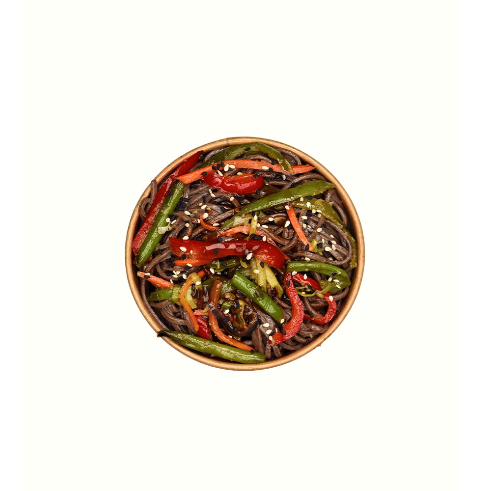 Tăieței de hrișcă „Soba” cu legume mixte (fasole verde, praz, dovlecei, ardei dulce, morcov, ceapă roșie, usturoi) în sos dulce-acrișor. Greutatea este indicată cu o eroare de +/- 7%.