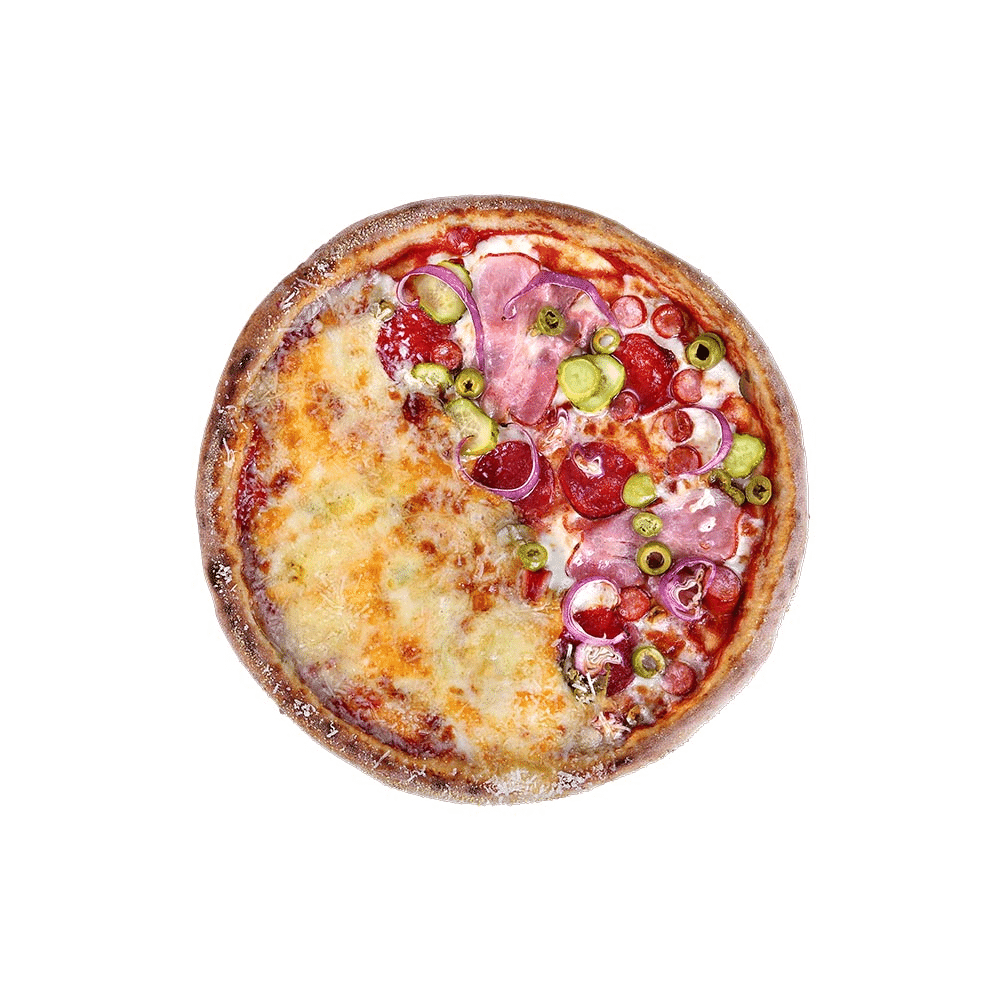 Bacon și mozzarella, parmezan și salam, măsline și murături, dor blue și gorgonzola...Două jumătăți - Eu și tu, El și ea, Roșu și negru, Maestru și Margarita, Yin și Yang, Romeo și Julieta...Nu mai visa!!!! A venit pizza, e timpul să mâncăm. Greutatea este indicată cu o eroare de +/- 7%.
